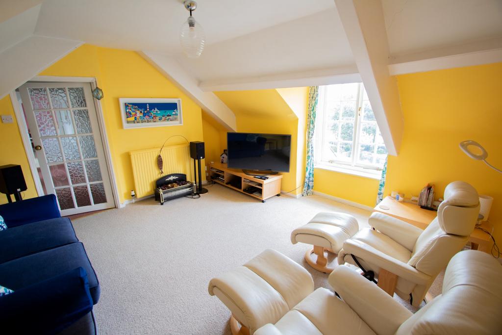 This apartment occupies the entire top (third) floor of the building and enjoys fine sea views from all the principal rooms. From the communal hallway, the front door opens to a private staircase with useful storage cupboards, leading up to the main hallway. Here, there is a built-in cupboard with plumbing for an automatic washing machine.