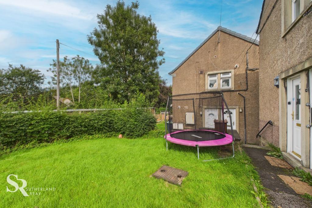 Primarily laid to lawn, this garden offers an open space bordered by a neat hedge, providing a degree of privacy. A garden path leads up to the front door.