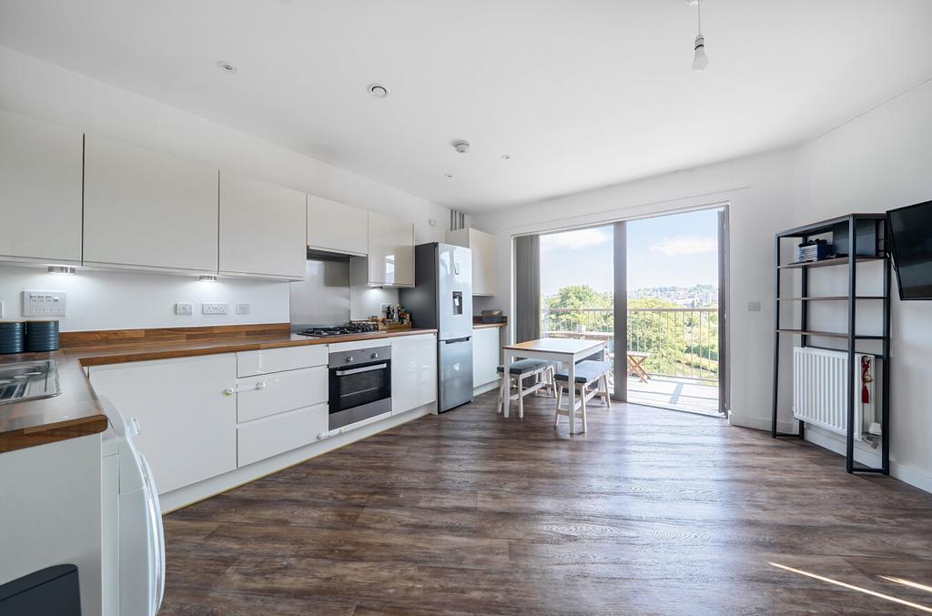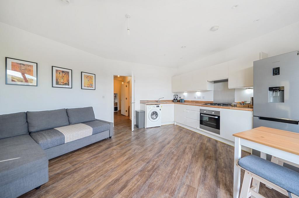 SHARED OWNERSHIP (Advertised price represents 30% share. Full market value £300,000). This smartly-presented flat is on the top (third) floor of a modern development. The property has an open-plan kitchen/reception room with sleek, handle-less units and attractive flooring. A large, glass door leads out onto the south-east-facing balcony which provides a delightful and far-reaching view, taking in the meandering River Wey and its verdant banks. Additional, internal, features include a spacious bedroom with window bay and fitted, mirror-fronted wardrobe. There is a stylish bathroom and a hallway storage/utility cupboard. Well insulated walls and roof, high performance glazing and gas central heating all contribute towards a very good energy-efficiency rating. The flat comes with use of the communal cycle store, Guildford Railway Station is only a short walk away and the picturesque town centre is also within easy reach.