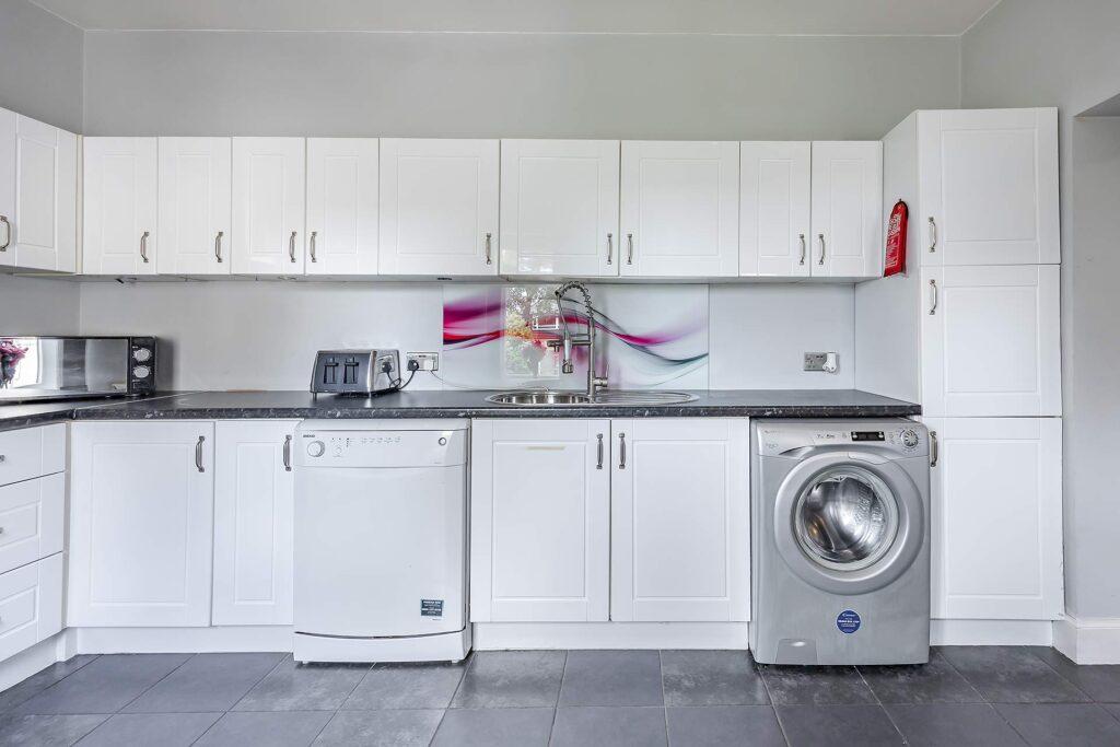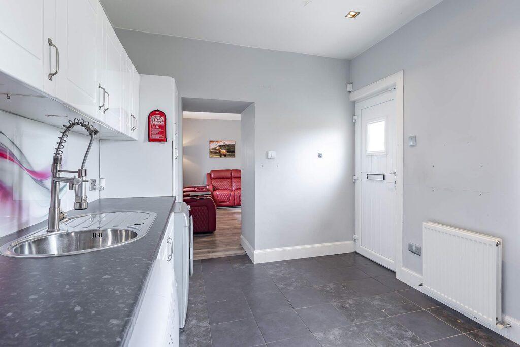 The heart of the home is the spacious lounge - perfect for entertaining guests or relaxing in comfort. Adjacent, the contemporary kitchen features white cabinetry, contrasting black worktops, and freestanding appliances.
