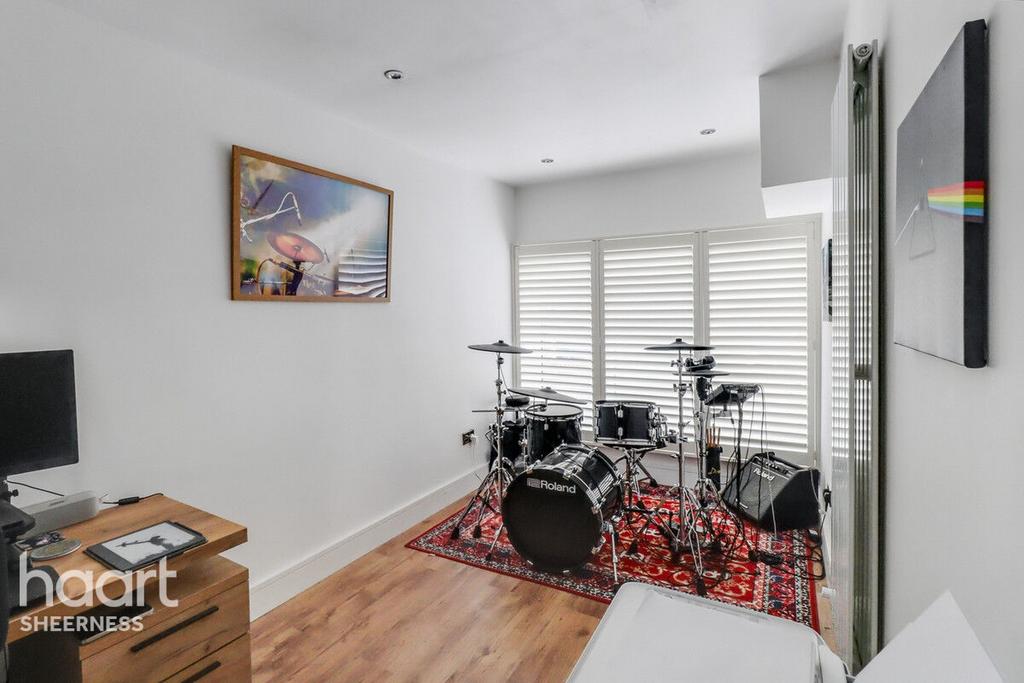 The property boasts three spacious double bedrooms, a stylish modern shower room, and a separate WC. The lounge provides a cosy retreat at the end of the day, while the former garage has been thoughtfully converted into a versatile study/music room, which could also serve as a fourth bedroom if required.