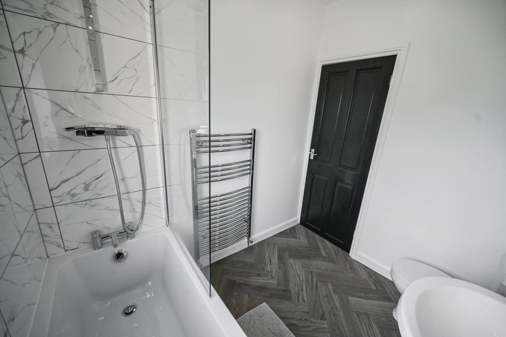 Bathroom: 7’7’’ (2.30m) x 6ft (1.82m) Fitted with a new luxury white suite comprising panelled bath with chrome shower spray & side screen, pedestal wash handbasin, low level WC, chrome heated towel rail, marble effect tiled walls, recessed ceiling spotlights, extractor fan, herringbone style vinyl flooring and double glazed opaque window to rear.
