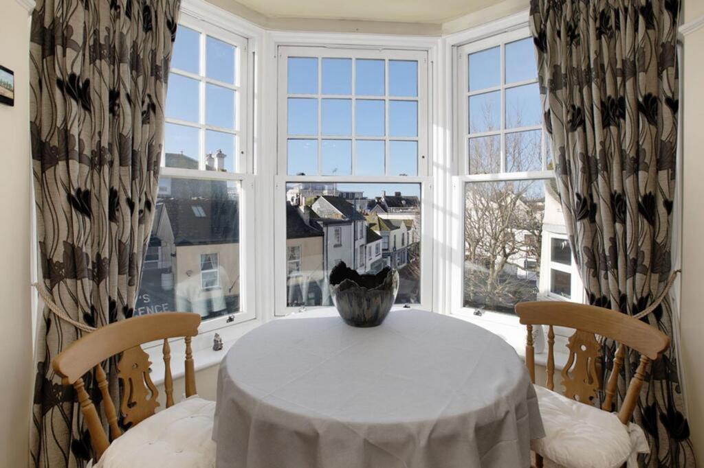 Stepping in to the entrance hall of the apartment, to the left there is the lounge and kitchen and to the right there are two double bedrooms, shower room and store cupboard. The lounge is particularly bright with a dual aspect large bay window with sashes and outlook towards the active town centre, and additional large window with sashes and attractive outlook of far reaching sea views. Original attributes in the lounge and throughout the property provide charm and elegance. The contemporary fitted kitchen has base and wall mounted units with laminate roll edged countertops, neutral toned tiled splash backs, single bowl composite sink with mixer tap and drainer, four ring induction hob with concealed extractor hood over, electric oven/grill, integral fridge/freezer, integral dishwasher and washer/dryer and a sash window to the side.