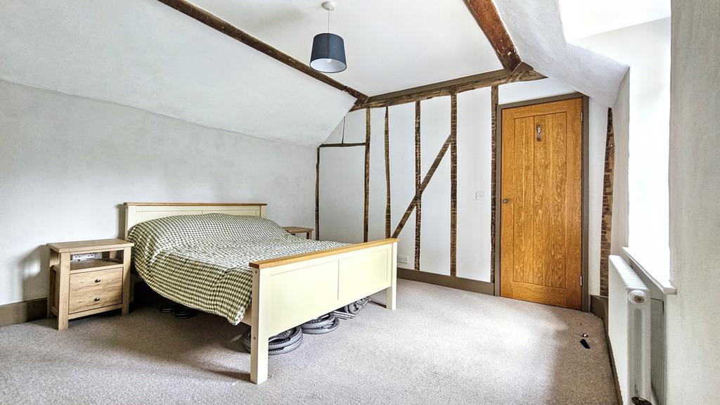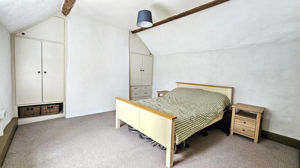 BEDROOM 2 with fitted carpet, radiator, exposed wall and ceiling beams, front window with views, two recessed wardrobes, and six power points.