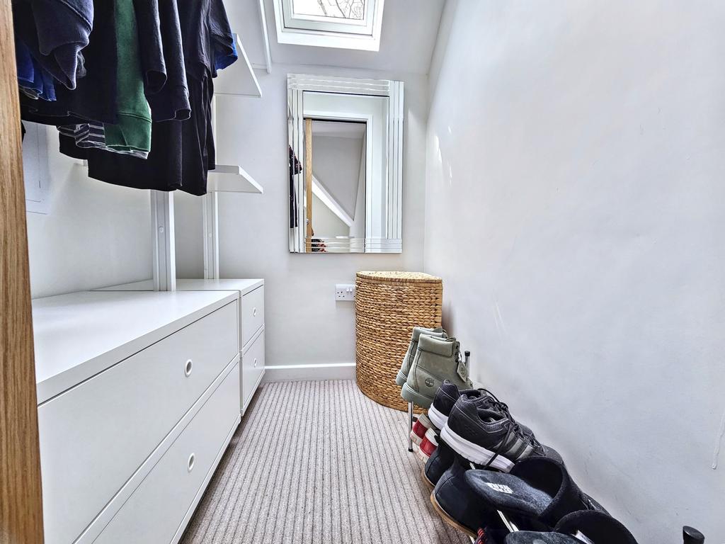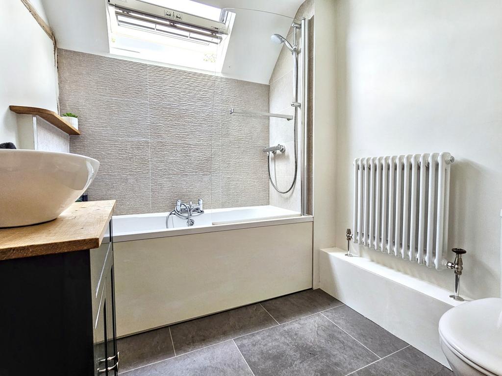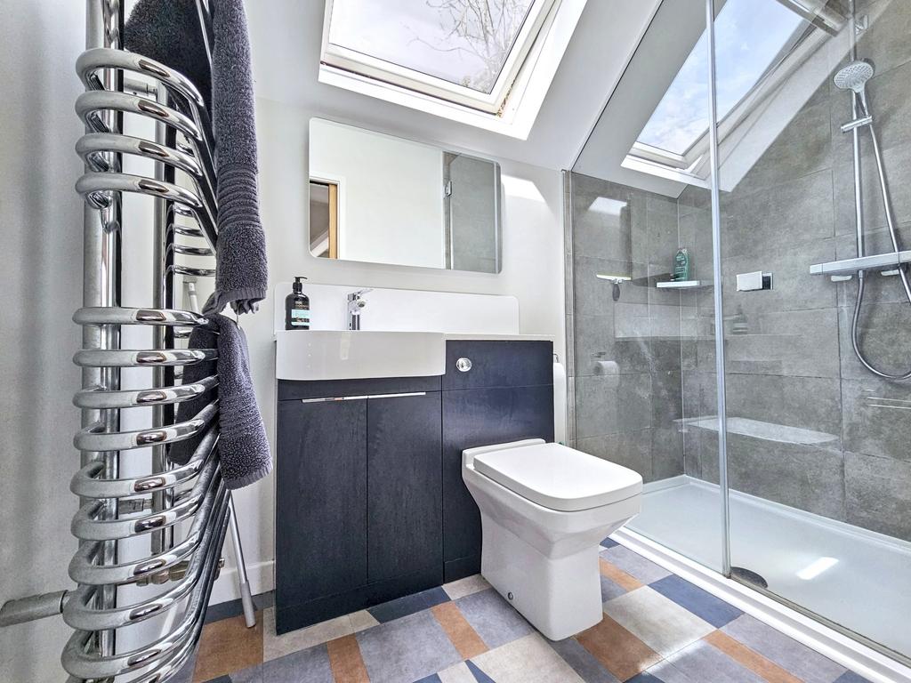 EN SUITE SHOWER ROOM with tiled floor, skylight window, heated towel rail, and white suite with walk in tiled shower, WC, and washbasin set into vanity unit.