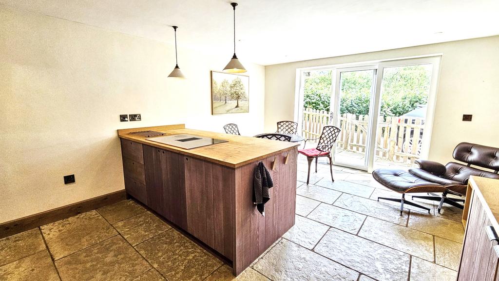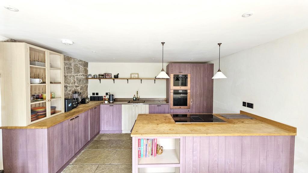 'Bertazzoni' high level electric double oven, integrated fridge, freezer and dishwasher. Exposed beams and feature exposed stone walling, wall shelf, ceiling spotlights, eleven power points, and glazed double sliding doors to the front patio area.