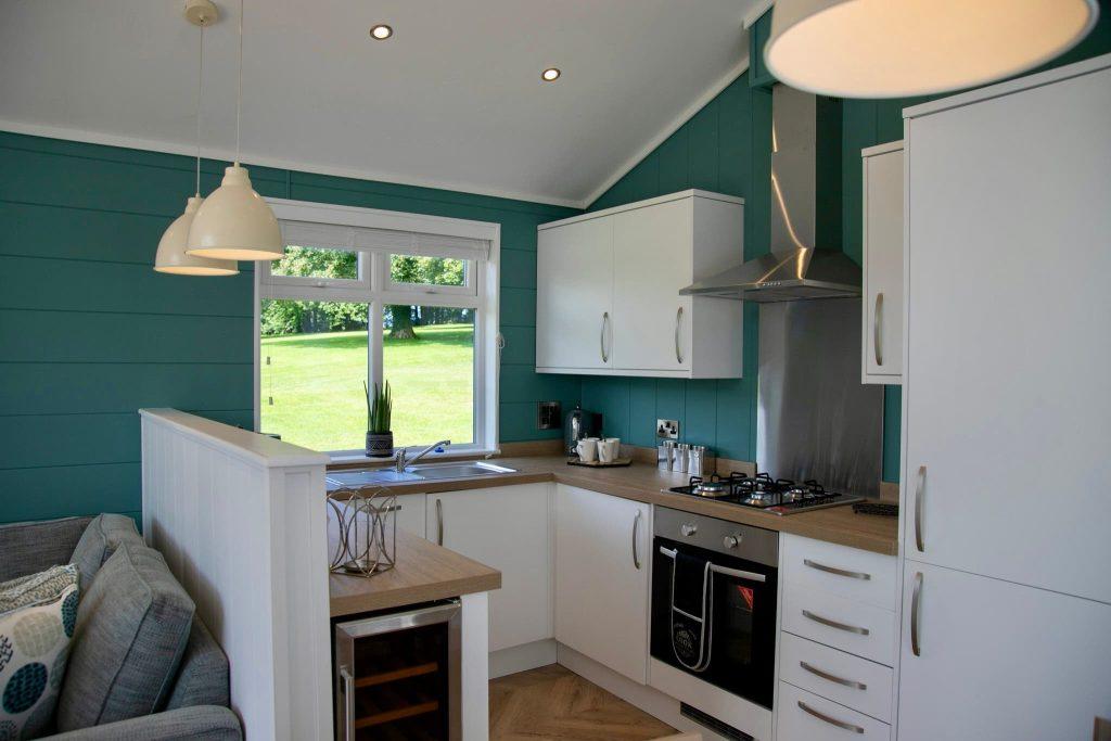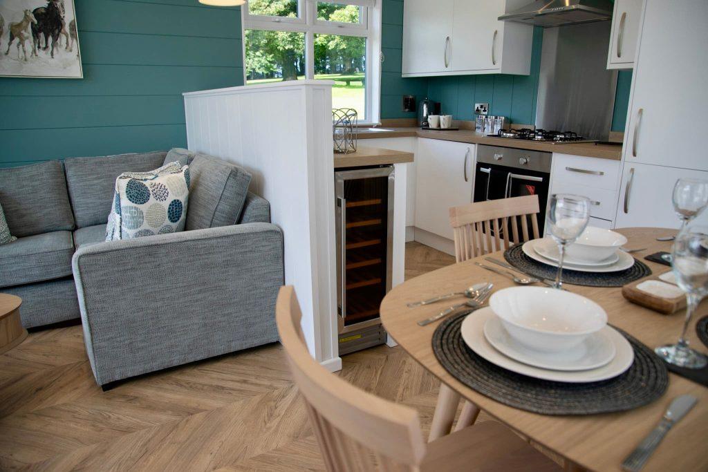 The Skylark has a bright and spacious open plan living area with front end patio doors which open up onto a front end deck. The living area has a large corner sofa which is also a bed conversion, arm chair, coffee table and TV cabinet, perfect for the family to relax and watch a movie in the evening.