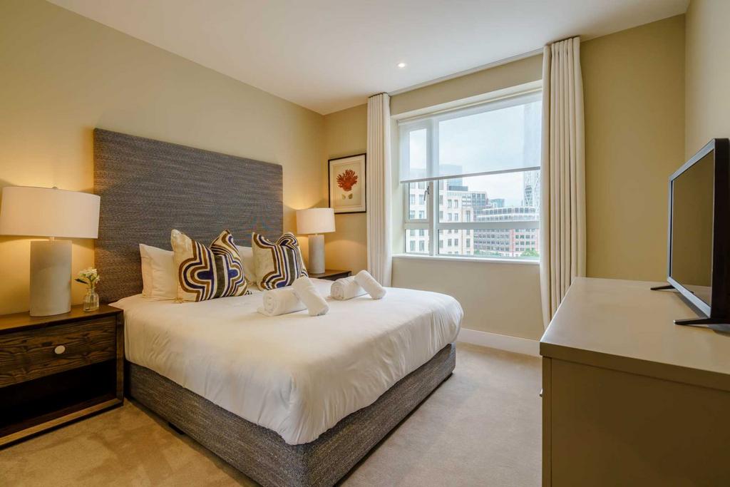 This luxurious interior designed two-bedroom, two bathroom apartment on the eighth floor of this waterfront estate is set over 966 SqFt. This spacious apartment with modern open-plan living space is fully furnished and enjoys light oak wooden flooring and dedicated dining area in the reception room.