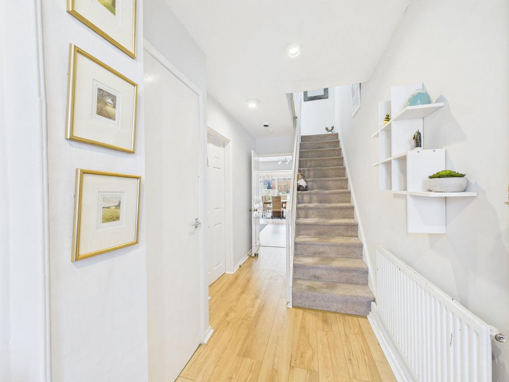 The entrance hallway immediately sets a warm and inviting tone for the home, with its light décor and wood-style flooring creating a bright, modern feel. From here, you have access to the kitchen as well as the spacious living and dining area, making it a natural hub that connects the key spaces of the ground floor. A staircase rises to the first-floor landing, drawing the eye upwards and enhancing the sense of space.