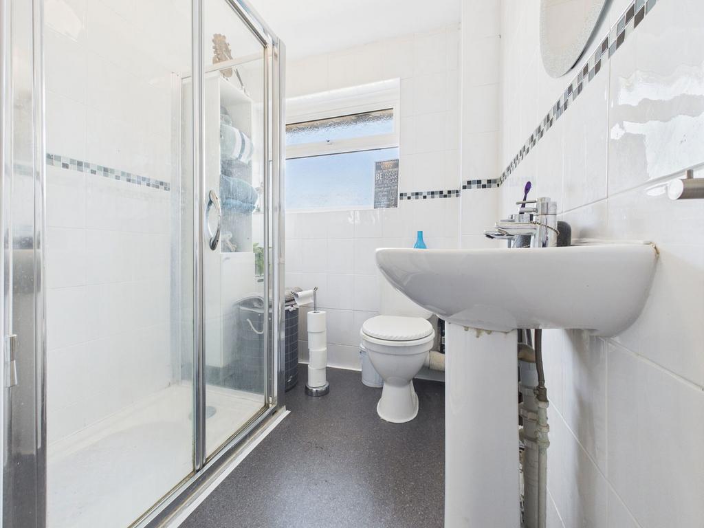 The family shower room is fitted with a modern white suite, comprising a shower enclosure, WC, and wash hand basin. Tiled walls with a decorative border provide a clean and contemporary finish, while the front aspect window allows natural light to brighten the space. Practical and easy to maintain, this room offers everything needed for busy family living.
