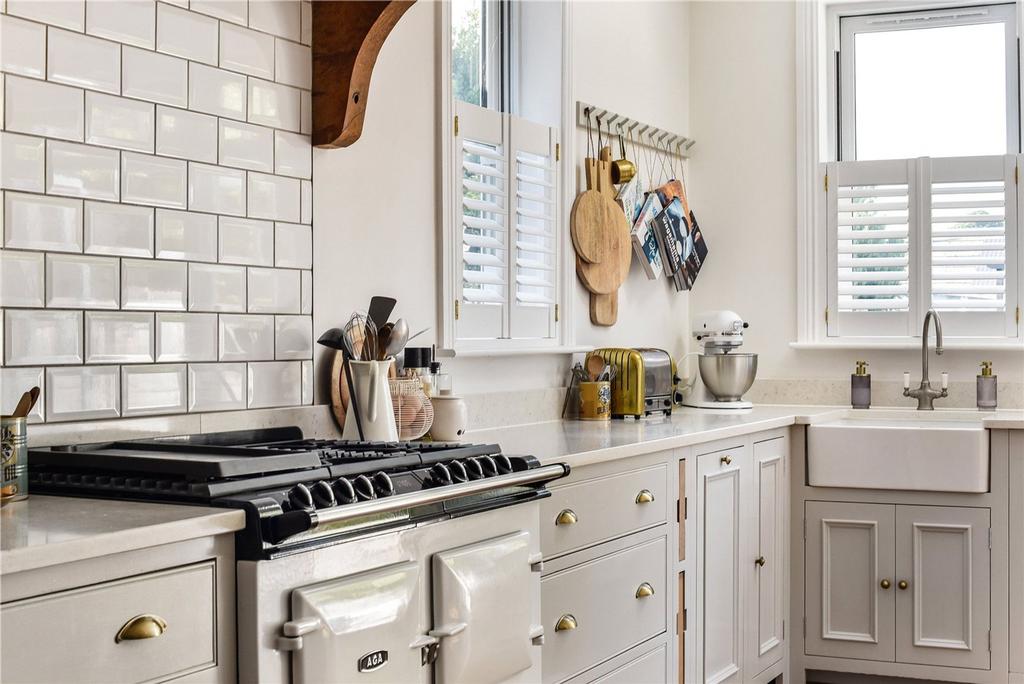 On the ground floor the accommodation is arranged around a superb open-plan kitchen, dining and living space with a beautiful bespoke Neptune kitchen with integrated appliances, AGA cooker, and butler sink with glazed double doors leading directly to the terrace and gardens beyond. The adjoining snug is centred around a double-sided wood burning stove, also serving the sitting room, and provides additional family living space. To the front of the house is a separate sitting room with bay window and fitted cabinetry around a feature fireplace. A utility room and cloakroom complete the ground floor.