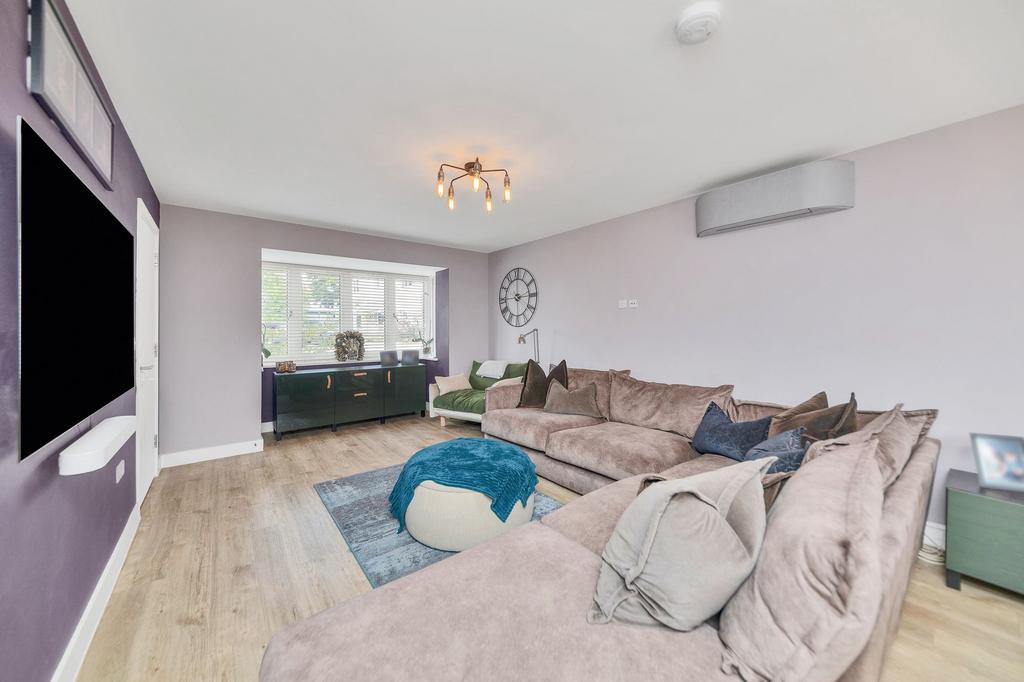 The lounge is an excellent size, benefiting from a large bay window to a front aspect, double French doors to the rear, attractive LVT wood flooring, pendant lighting, neutral decor and ample space for a variety of lounge and storage furniture.