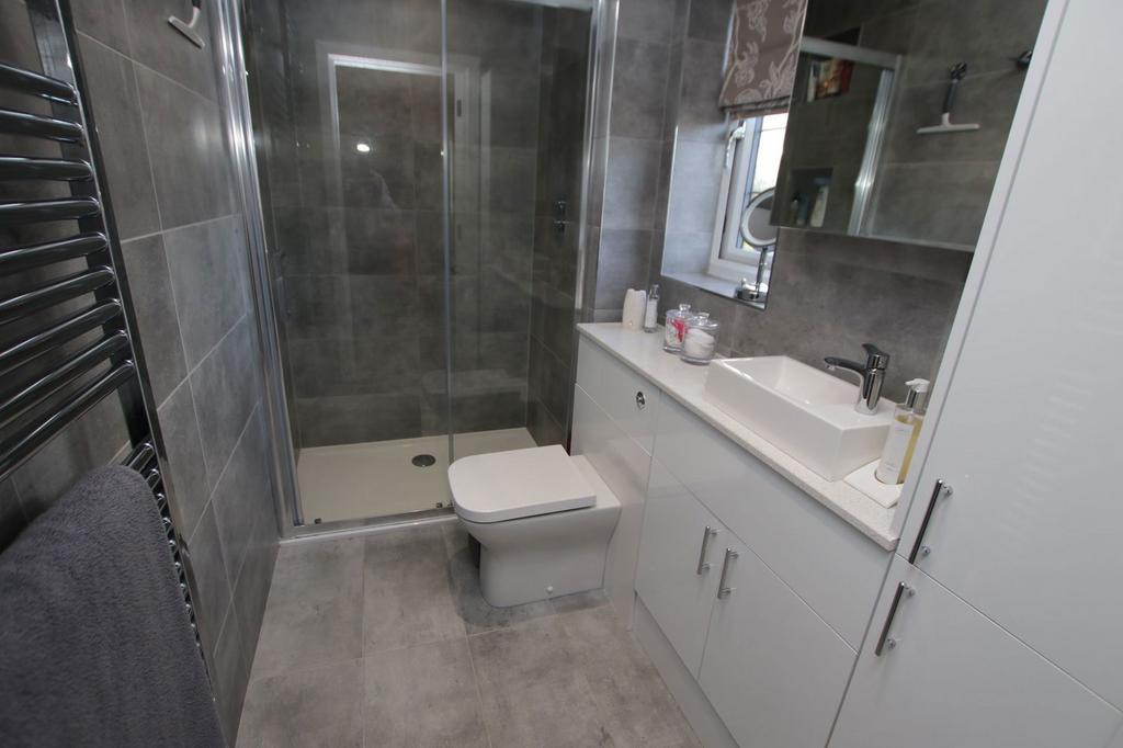 Having full height tiling to the walls with further floor tiling and providing a three piece suite in white comprising of a generous shower cubicle with thermostatic shower, vanity wash hand basin with cupboard beneath and low flush WC. There are ceiling downlighters, an extractor fan and a heated chrome towel rail.