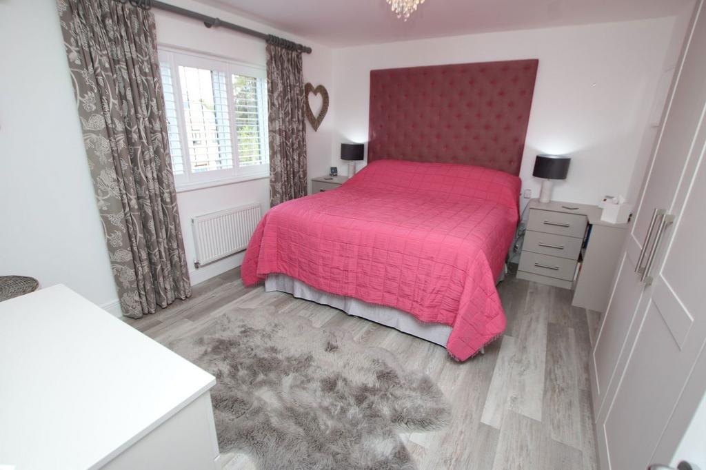 Having high quality grey oak effect LVT flooring, the Master Bedroom is heated by a single panel radiator and also has fitted window shutters to the rear facing windows. The room provides two built-in double wardrobes along with bedside cabinets, a further walk-in wardrobe with single panel radiator and this bedroom also enjoys air conditioning.