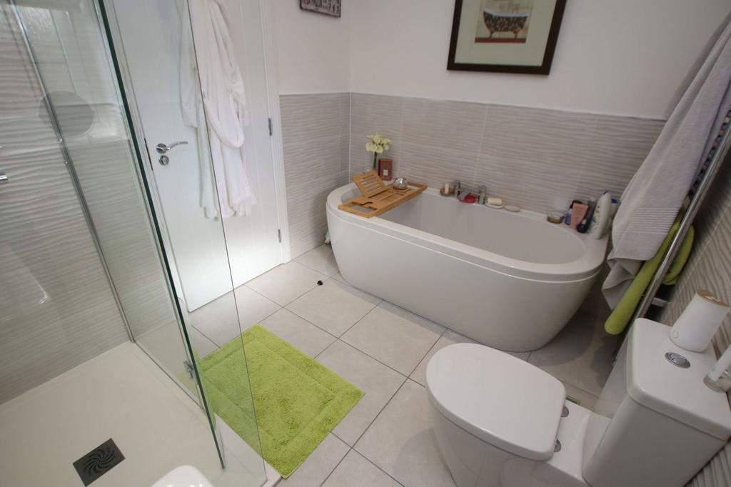Displaying half-height tiling to the walls with further floor tiling and providing a four piece suite in white comprising of a panel bath, generous shower cubicle with thermostatic shower, vanity wash hand basin with cupboard beneath and low flush WC. There are ceiling downlighters, an extractor fan, electric shaver point and a heated chrome towel rail.
