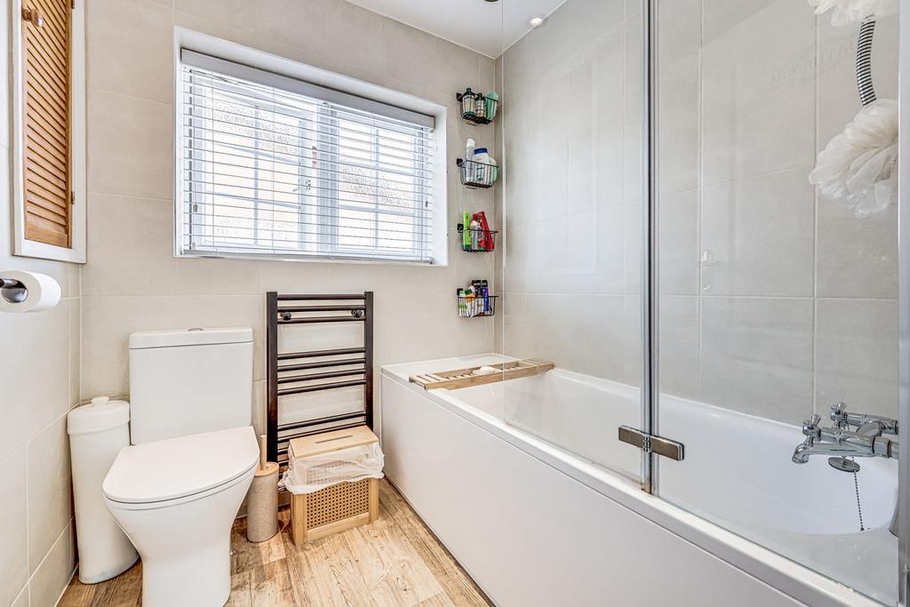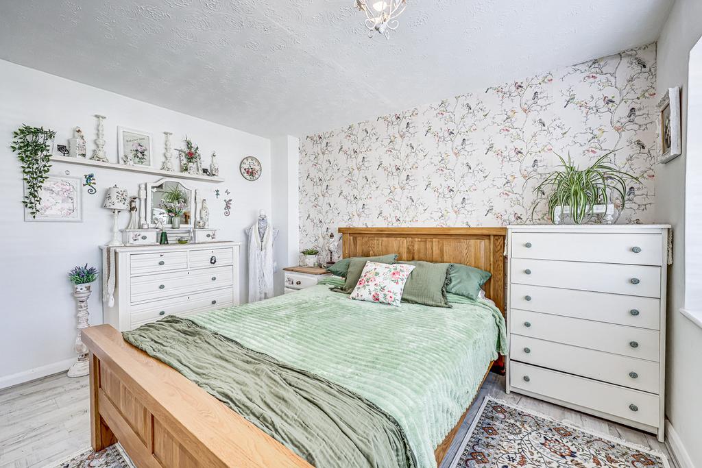 The first floor hosts three well-proportioned bedrooms, each tastefully decorated and offering excellent versatility for a family. The principal bedroom and second bedroom are both generously sized doubles, while the third bedroom makes for an ideal child’s room, nursery, or study. A well-appointed family bathroom with a three-piece suite completes this level, providing comfort and functionality.