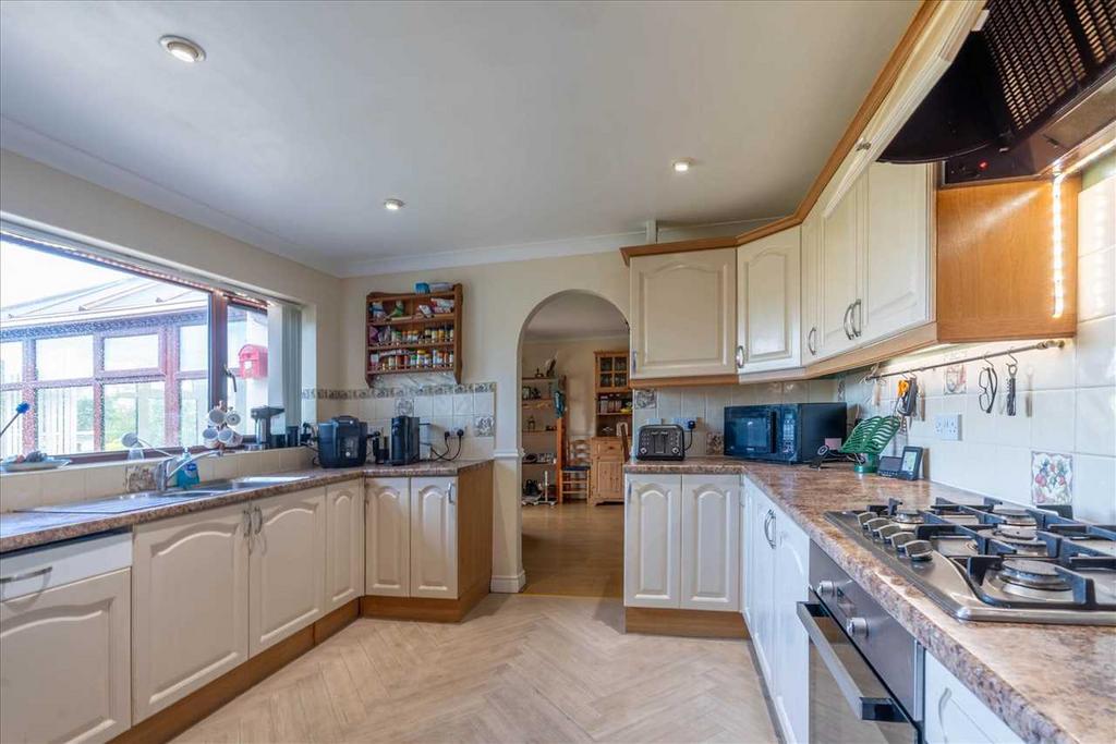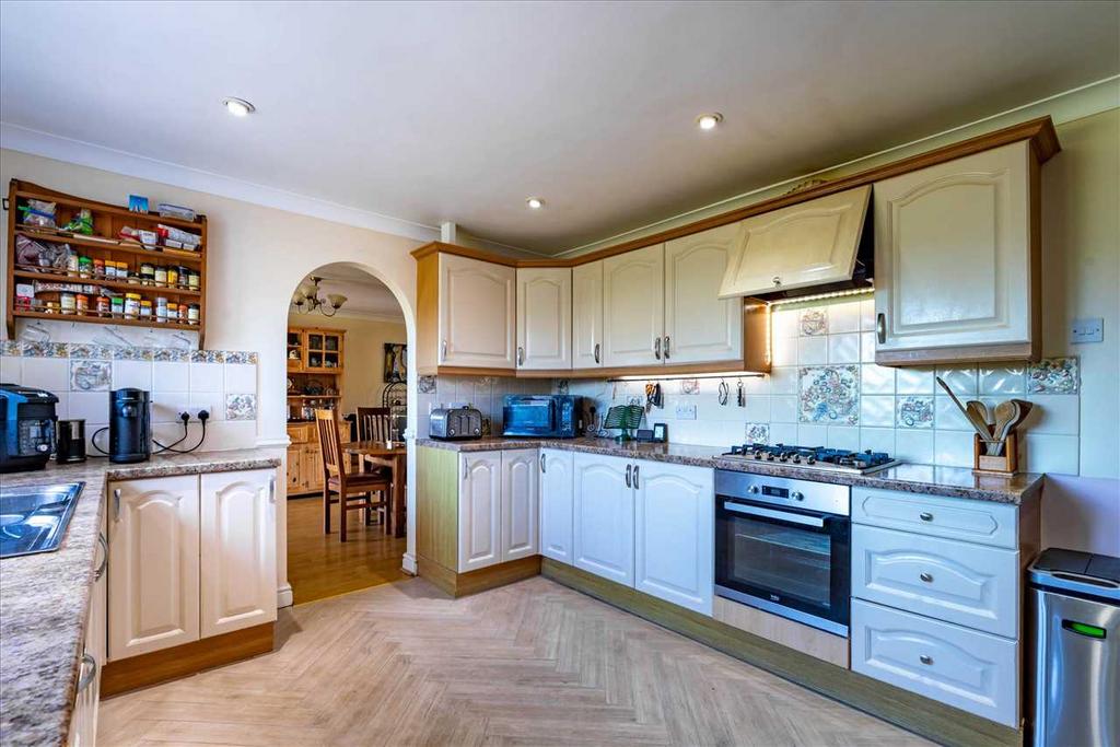 Continuing off the dining room an archway takes you through into the kitchen with base and wall storage cupboards with complementary high gloss work surfaces, stainless steel on and a half bowl sink with mixer tap, built under electric oven with gas hob and integrated extractor over, integrated dishwasher, space for free standing wide fridge/freezer, complementary tiled splash backs, recently fitted flooring, coved ceiling, recessed lighting, window to rear aspect overlooking the garden, door through into the inner hallway and glazed panelled door into the utility room with base, wall and tall storage cupboards, space for free standing washer and dryer with complementary high gloss work surface over, wall mounted combi gas central heating boiler, extractor fan, ceramic tiled flooring, window to rear aspect overlooking the garden and double glazed door leading out onto a flagged pathway and garden.