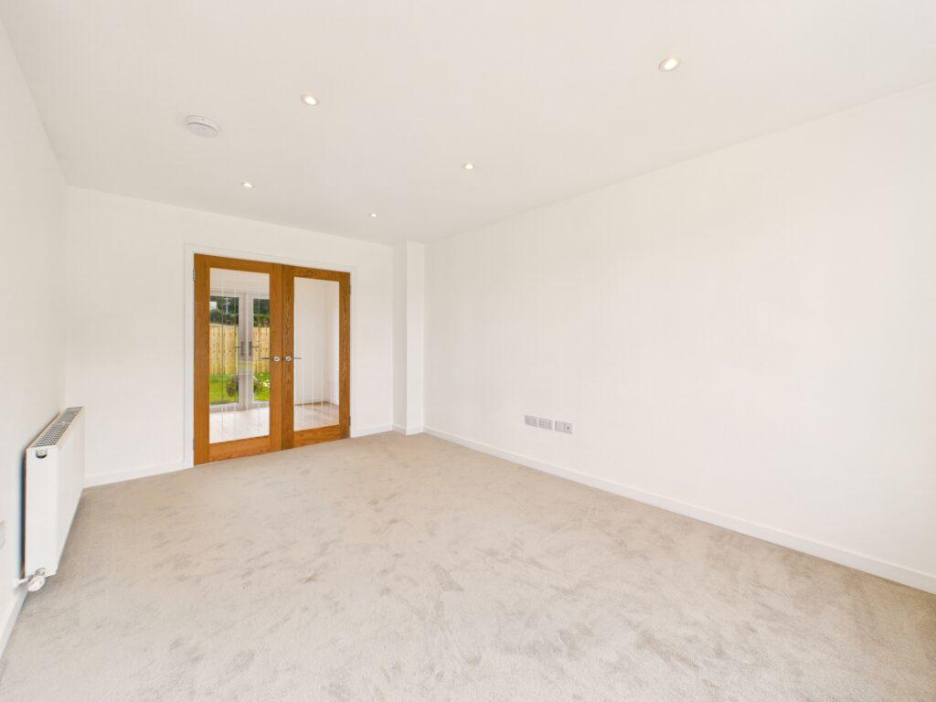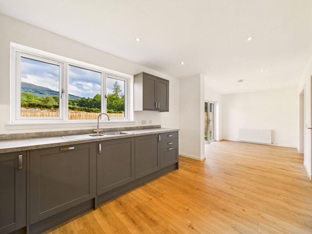 An inviting room with dual aspect sunlight through front facing windows and glazed doors to the rear dining area and onward to the garden patio. Partial loch views in the distance, newly laid carpeted flooring, central heating radiator, spotlighting, socket points and tv point. Ample space for freestanding lounge furniture.