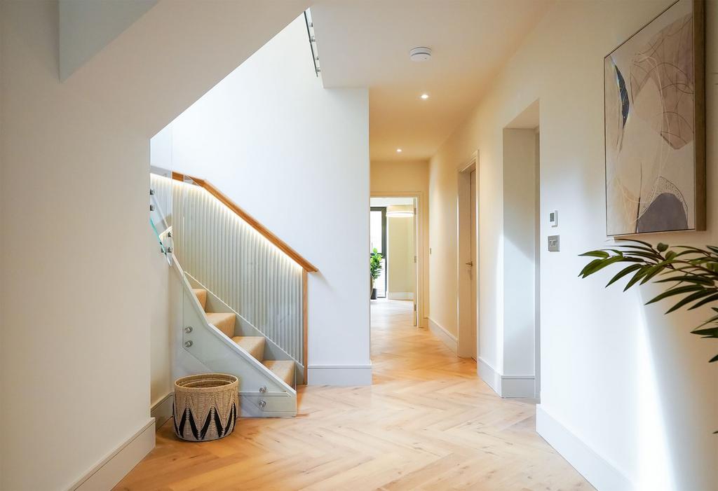 Rowan House offers an impressive 2870 sqft of accommodation and is conveniently set across two floors. The Karl Benz Italian-designed kitchen features a striking quartz waterfall island, bespoke mirrored splashback, and a full suite of premium Siemens appliances, including three ovens, an induction hob, warming drawer, and integrated larder fridge and freezer. This open-plan space flows effortlessly into the dining and living area, where large, full-height, full-width sliding doors open onto a porcelain-paved patio - perfect for entertaining. A cosy wood-burning stove further adds to the appeal of this room. An exceptionally spacious hallway, additional living room with dual aspect bi-fold doors, utility and dedicated home office complete the ground floor. A feature staircase with glass balustrade and ambient lighting leads to the upper floor.