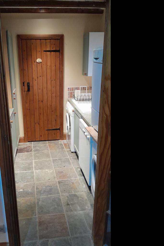 Fitted kitchen cabinets, slate tiled flooring, space for washing machine and dryer, WC