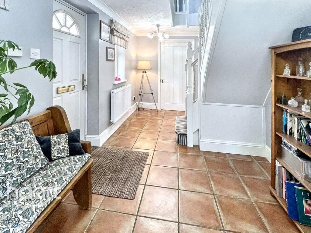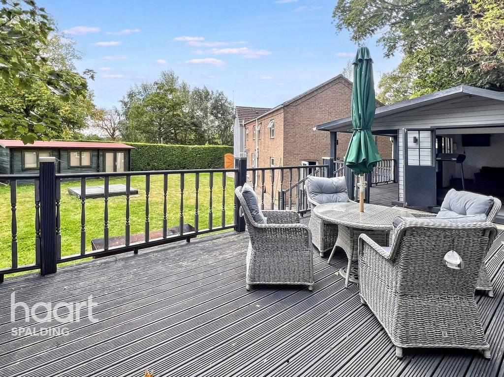 To the rear, you'll find a beautiful garden with a raised deck, ideal for hosting gatherings or enjoying tranquil views of the green. A stylish summer house and designated entertaining area add to the property's outdoor appeal, creating a true extension of the living space all year round.