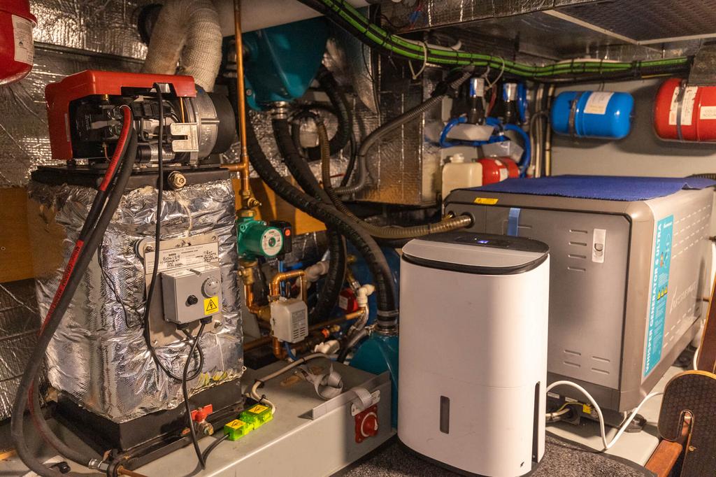 well organised engine room with plenty of storage with good access to the engine central heating, hot water, electrical and batteries.