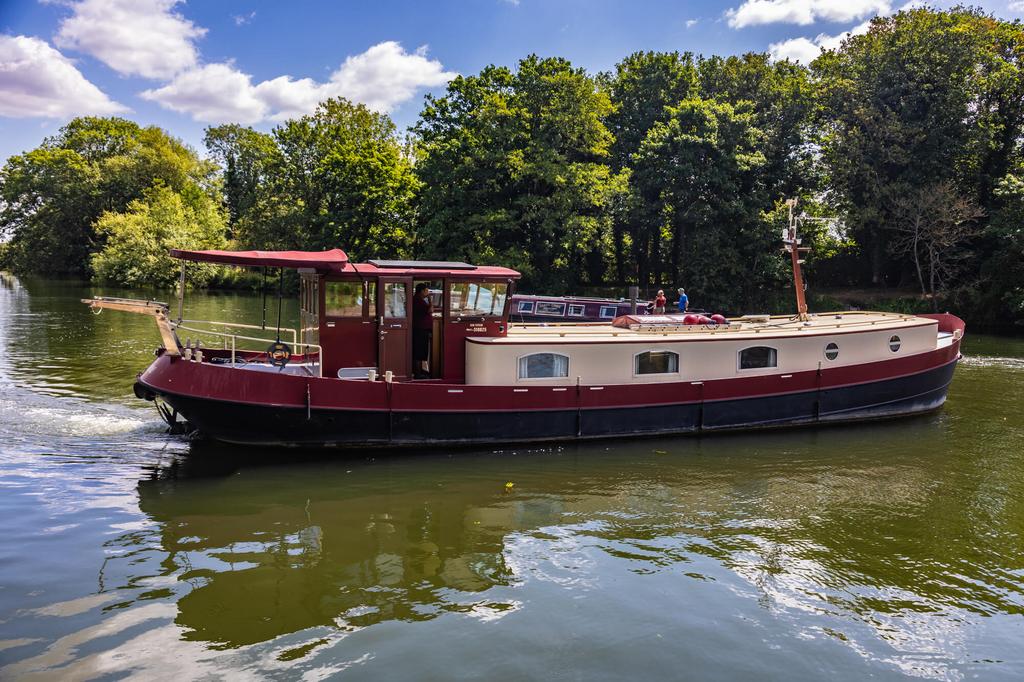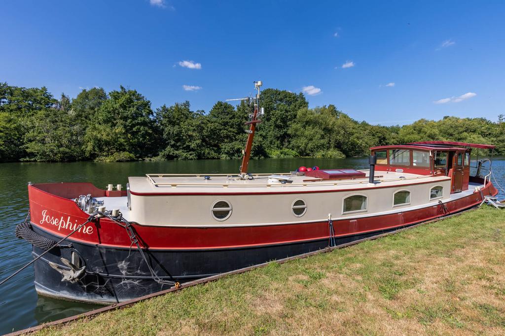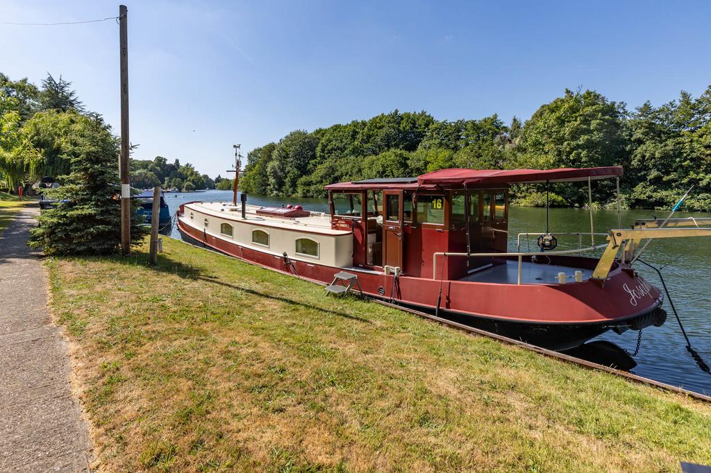 Josephine is an exceptional Dutch barge, offering the rare combination of elegant living and a fully residential mooring with uninterrupted views of the River Thames, just moments from Windsor. Situated on a peaceful stretch of riverbank with stunning views, the spacious mooring includes a postal address, mains electricity, water, refuse collection, large storage units and a beautifully maintained tree lined grassy area perfect for entertaining or quiet afternoons in the sun.