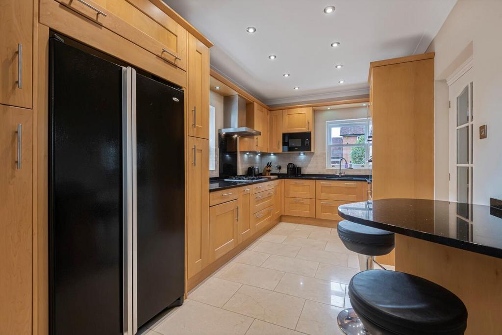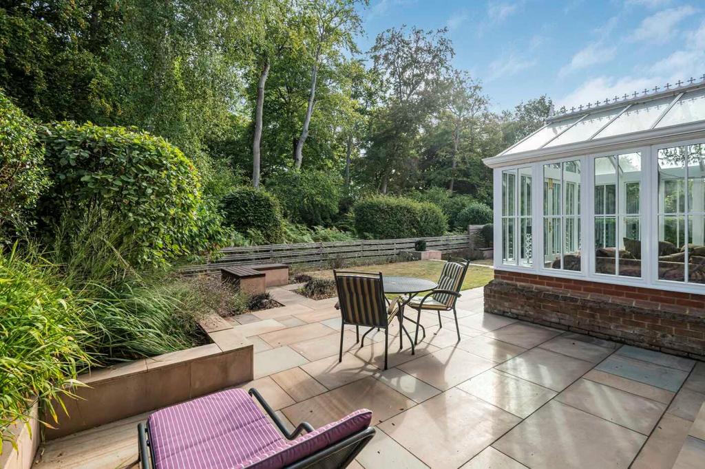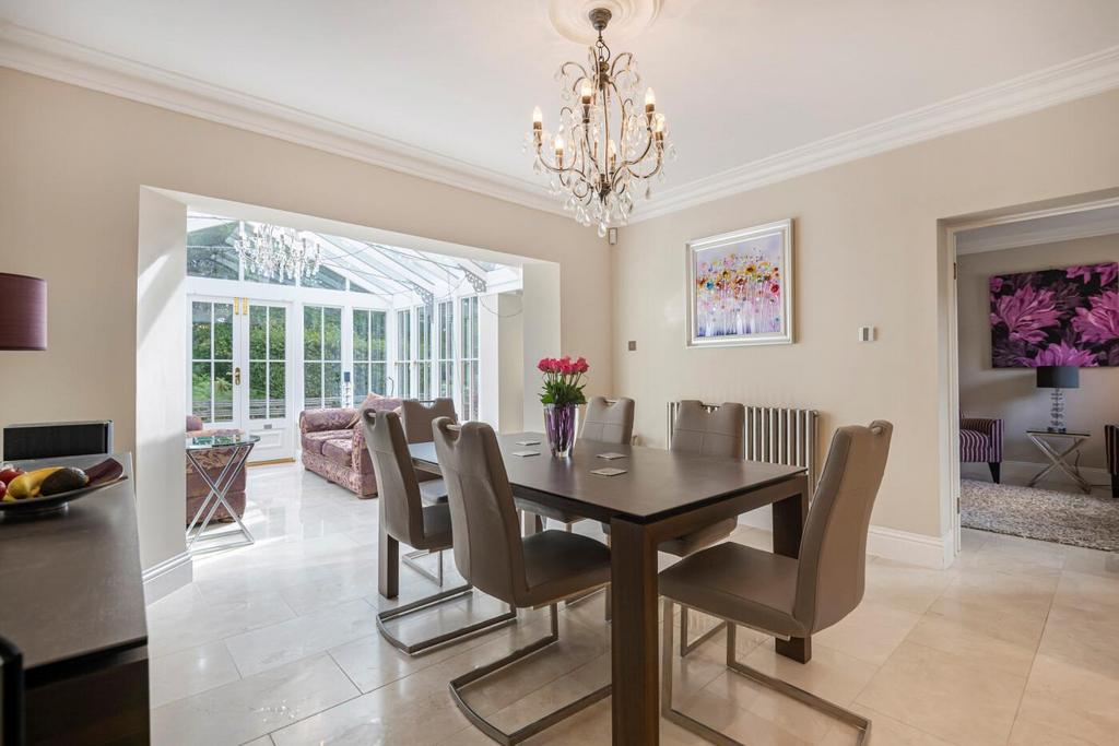 The kitchen is equipped with fully fitted units, granite work surfaces, and integrated appliances, including a split-level oven, Miele hob and hood, dishwasher, and a large fridge/freezer. A breakfast bar offers informal seating, and the kitchen has doors that open into the dining room, creating an excellent space for entertaining. The dining room flows into a conservatory, which features views of the rear garden. The formal living room showcases a central stone fireplace and a bay area with French doors that lead out to a terrace. Additionally, there is a reception room currently used as a study, featuring two front-facing windows.