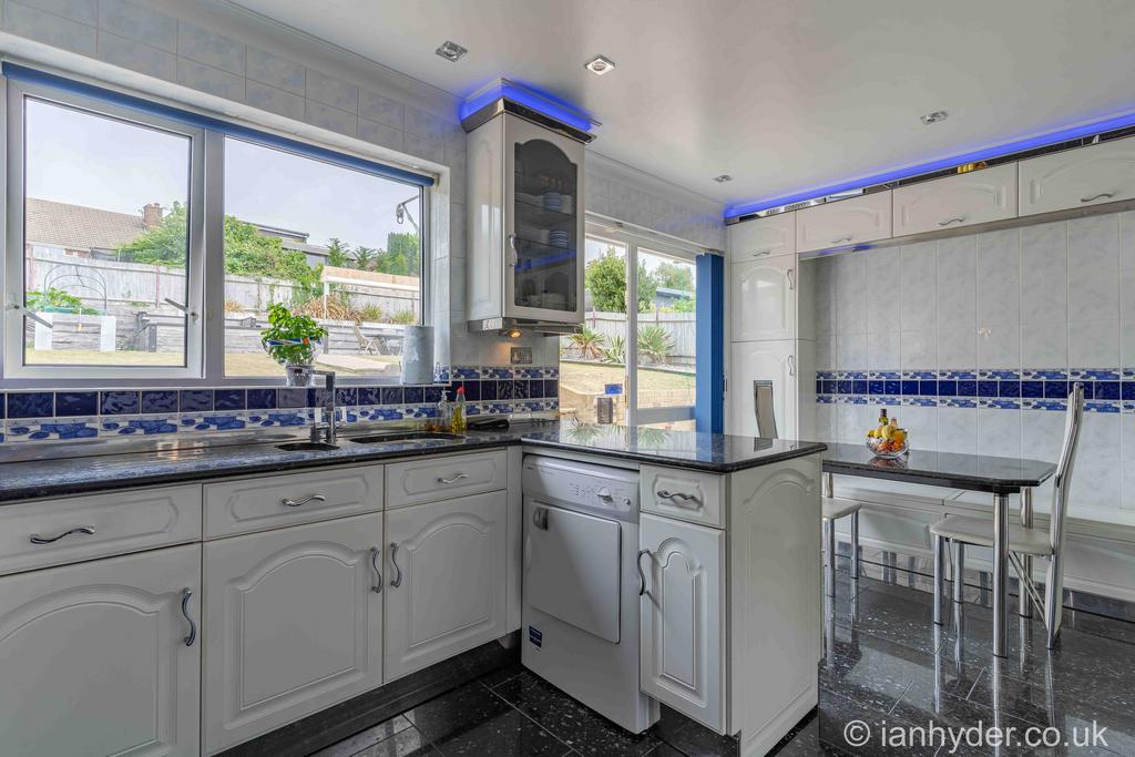 Double glazed windows overlooking rear garden and patio doors accessing same. Recessed ceiling spot lights, granite flooring with underfloor heating. Comprising a very well fitted room with tiled walls, range of base units, work surfaces and wall storage cupboards with under counter lighting, sink unit with mixer tap, space for cooker, with extractor fan above. Space for dishwasher, washing machine and tumble dryer. Cupboard housing gas fired boiler for heating and domestic hot water.