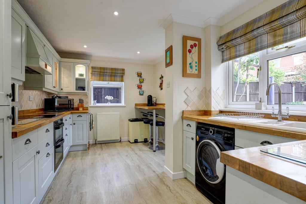 The welcoming entrance leads into a thoughtfully arranged ground floor, where a modern kitchen with warm wooden countertops and single door to rear garden.