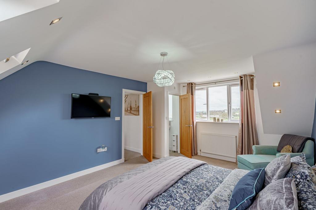 The stairs from the main hallway lead to a generous landing with potential for office space or additional storage with some characterful exposed beams. The boiler is housed in a cupboard here. The master bedroom is bright and generous with good head height and stunning long countryside views, it also has excellent under eaves storage. The ensuite is well appointed with quality fittings including mains shower, sink and wc with a heated towel real. There are two further bedrooms on this floor, one currently used as an office, the third bedroom is currently used as a dressing room but could be a double bedroom if required. The family bathroom is well appointed with quality porcelain fittings including an inset bath, shower, sink and wc, it also has a towel rail, velux window and exposed beams.