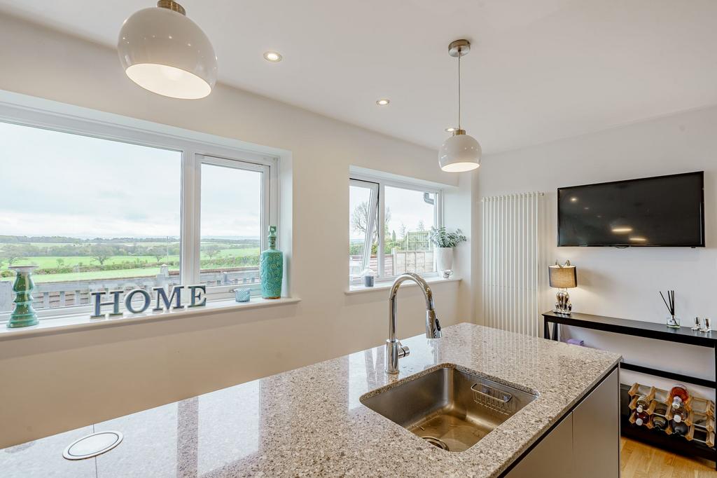 The property is entered through a generous hallway with a quality hardwood floor with the stairs and access to the main rooms. Here there is a practical well positioned WC with a newly fitted wall-mounted sink and toilet. There is also a useful understairs space, housing the washing machine, circuit board and meters with practical utility storage. From the hall is the exceptional and spacious open plan living room. This delightful and very sociable space is bright and has stunning views both onto the private garden to the south and to the hills towards Wetheral and beyond. There is a charming feature fireplace with wood burning stove on a slate hearth giving this bright room a real sense of winter cosiness in the cooler months. There are patio doors onto the decking area to the rear, providing quite stunning uninterrupted countryside views. Throughout the ground floor is a continuation of the quality hardwood flooring, adding to the sense of fluidity to this well thought out and recently designed property, it also has stylish vertical radiators. Sitting in front of the patio windows is the dining table, perfectly positioned to take in those views.