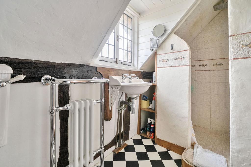Upstairs, there are three bedrooms arranged off a central landing. Two are generous doubles, each with views over the front garden and green. The larger of the two has a vaulted ceiling and built-in storage. A third single bedroom or dressing room and a shower room complete the first floor.