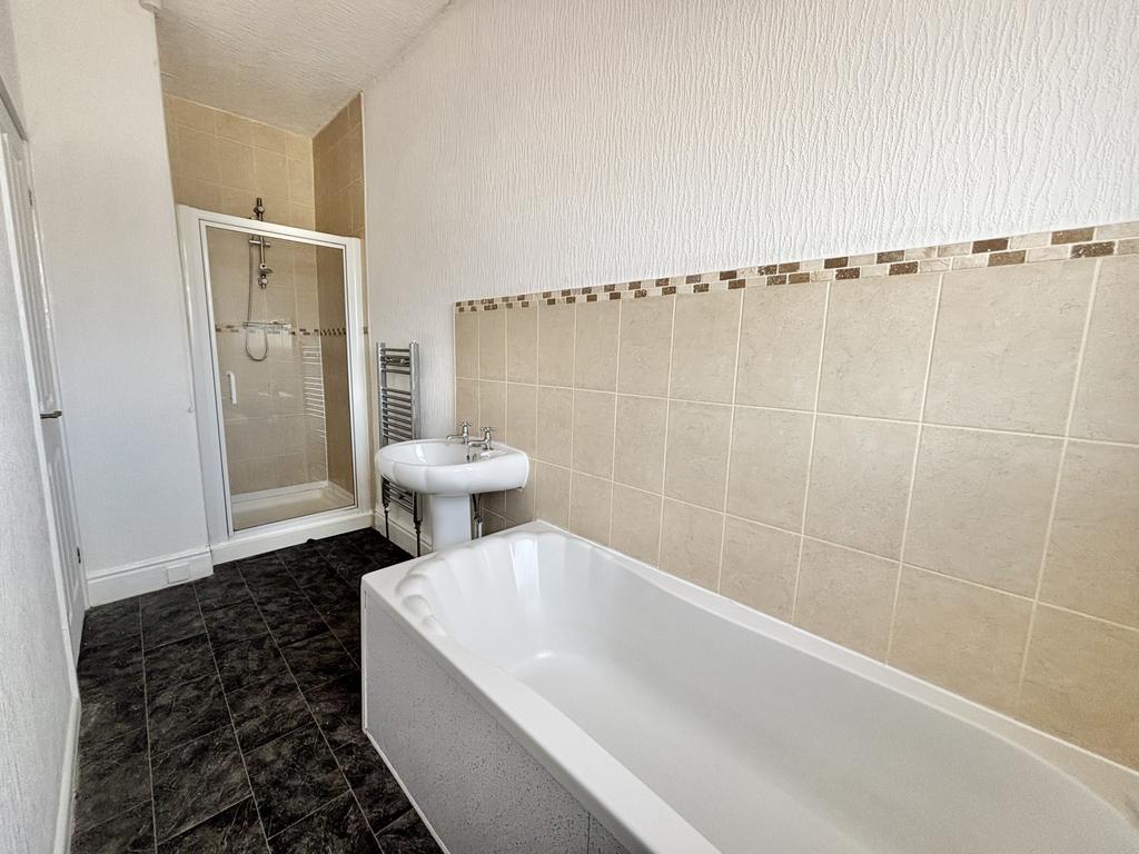 UPVC double glazed opaque window to the rear aspect, fitted four piece suite comprising panelled bath, separate shower cubicle, low flush WC, pedestal hand wash basin, heated towel rail.