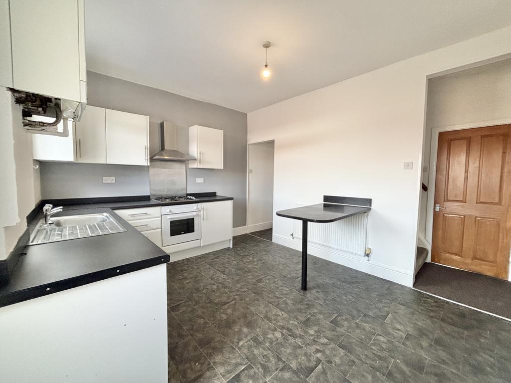 UPVC double glazed window and door to the rear aspect. Fitted kitchen with a range of wall and base units with complementary work surfaces, integral oven and four ring hob with extractor fan over, space for fridge/freezer, plumbed for washing machine, stainless steel sink with mixer tap, under the stairs storage cupboard, radiator.