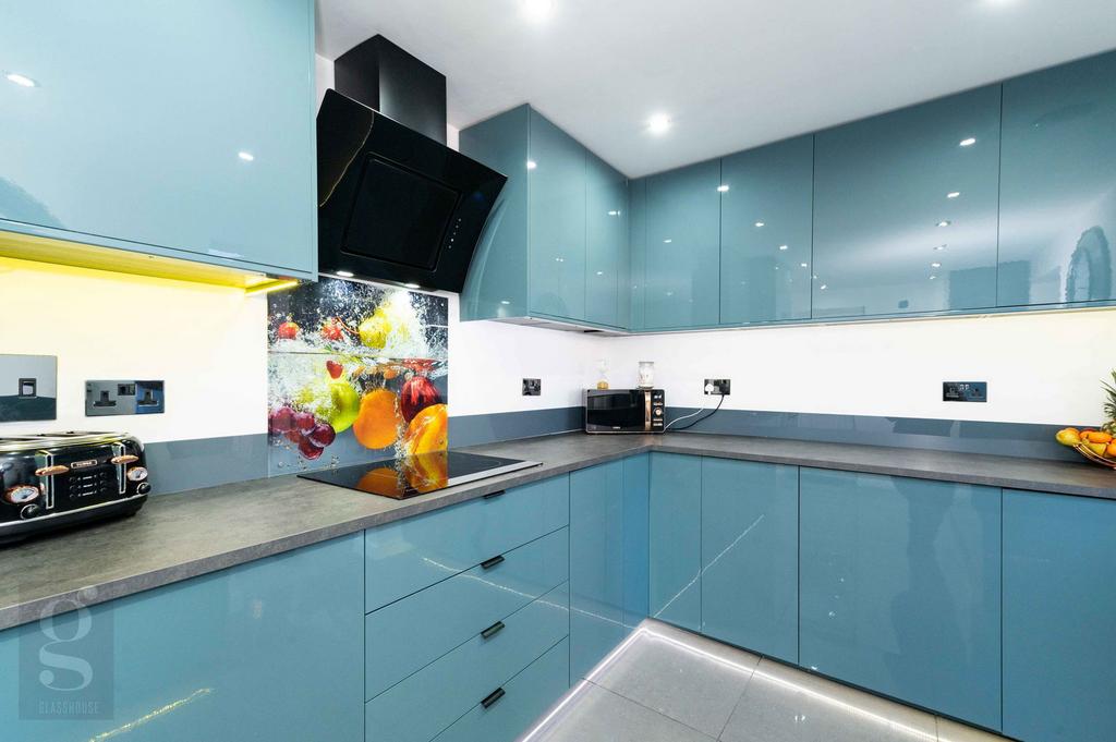 Kitchen: Eye-catching recently fitted modern Kitchen, with a wide array of high gloss units above & below complimented by grey laminate countertops. Well-lit by bright LED spotlights, under-unit downlighting and kickboard panel lights. Integral appliances include fan-assisted oven, electric hob, extractor fan hood, glass splashback with unique design, dishwasher, fridge and composite sink & a half with drainer. Concealed with a cupboard unit is the Worcester/Bosch boiler. The space is completed by large, polished porcelain tile flooring, with an opening leading through to the Orangery.