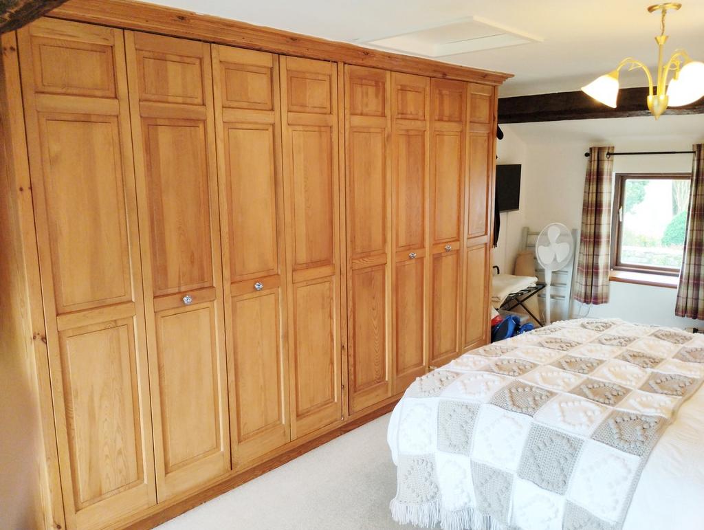 18’8” x 11’3” (5.69m x 3.43m) Fitted craftsman built 8 door wardrobe, exposed beams, wall lights, dual aspect large windows with low sills, radiator, center light.