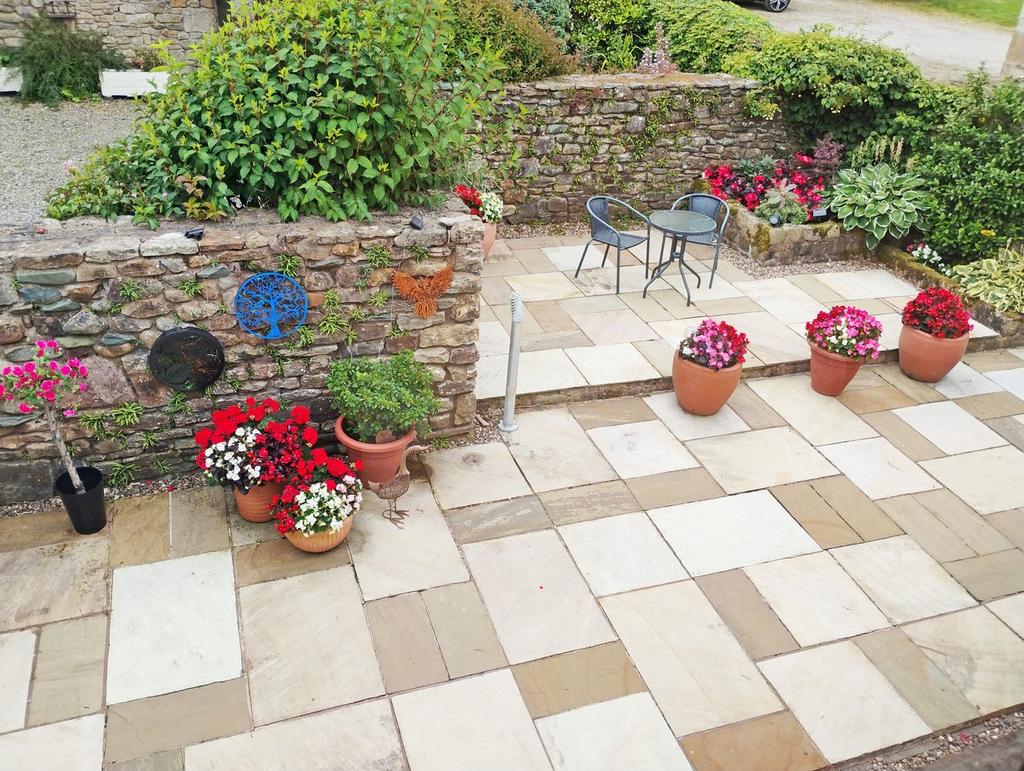 Generous paved patio / yard area privately enclosed within an attractive traditional stone walled boundary.