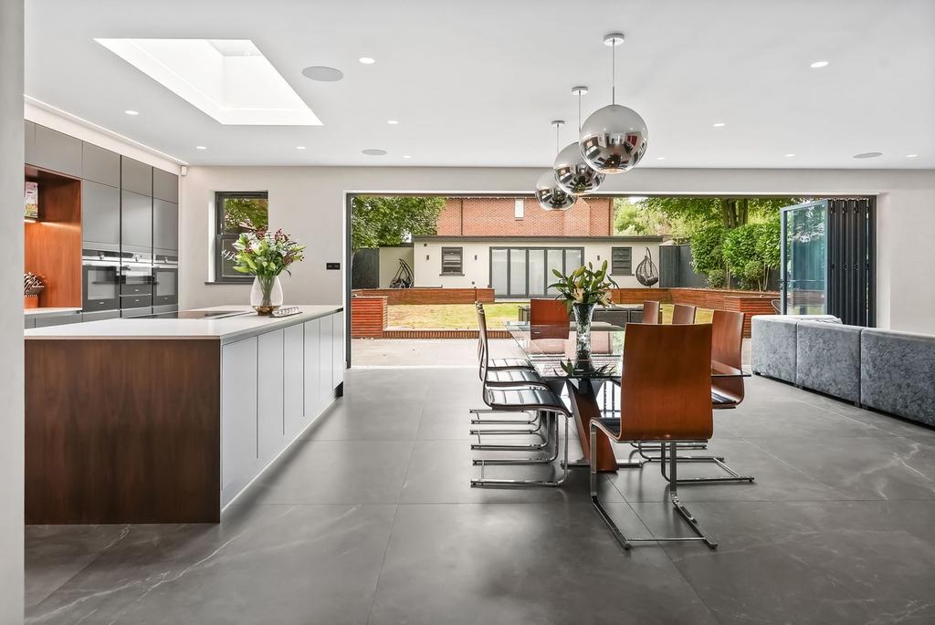 Internally, the accommodation is expansive and highly adaptable, comprising six generously proportioned bedrooms and five beautifully appointed bathrooms. Designed with both family living and high-end entertaining in mind, the home features four elegantly styled reception rooms, offering ample space for both formal occasions and relaxed everyday living. The impressive, fully fitted kitchen—with a central island, dining area, and open-plan reception space—flows effortlessly into the south-facing private garden, thanks to the enormous bi-fold doors. The outdoor area is an entertainer’s dream, with a patio and terrace ideal for enjoying the sunshine.