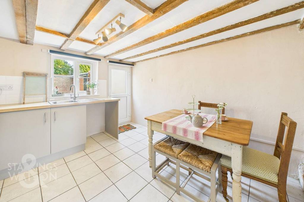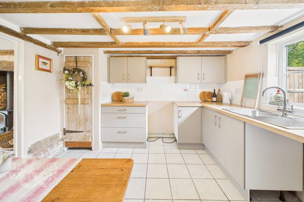 Entering via the main entrance door to the front you will find the main sitting room with stairs to the first floor as well as an inglenook fireplace housing a newly fitted woodburner. A door leads through to the kitchen/dining room beyond with a range of wall and base level units as well as wood effect worktops over and space for white goods, There is a built in cupboard as well as space for the dining table, exposed timbers and a door to the rear garden beyond.