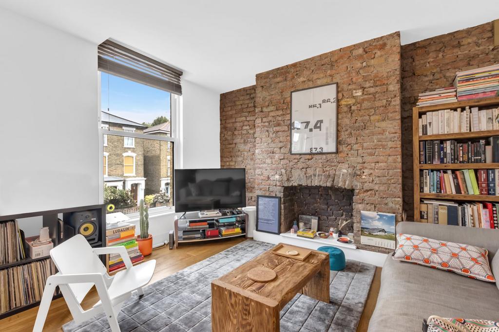 To the left, the home opens into a generous living and dining room. Two large windows flood the space with light, complemented by warm wooden floors. An exposed brick wall and feature fireplace nod to the building’s Victorian heritage, adding character and charm.