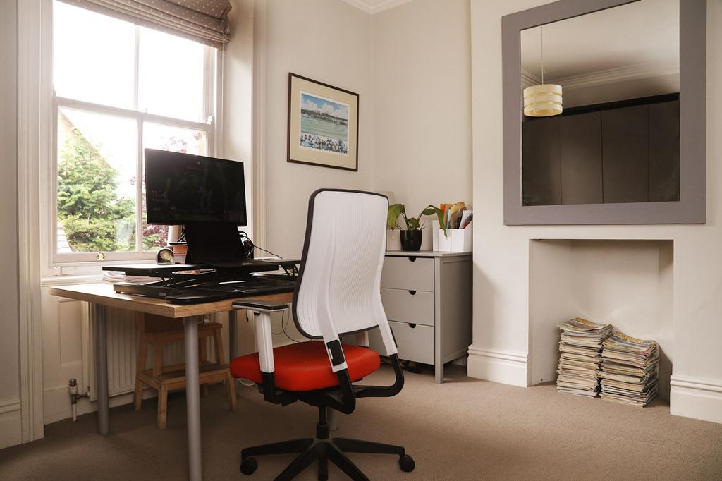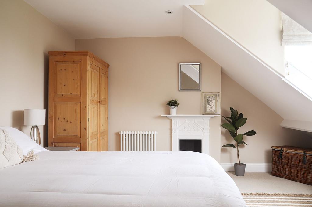 The second floor offers two further bedrooms, both bright, airy and beautifully presented. These are practical spaces that offer flexibility for guests, home working or additional family accommodation. One includes extensive fitted wardrobes, while the other features a crisp, pared-back palette and ornamental fireplace. A well-appointed bathroom with bath, WC and washbasin serves this floor, and a bright landing area at the top of the stairs offers potential as a reading nook or study space.