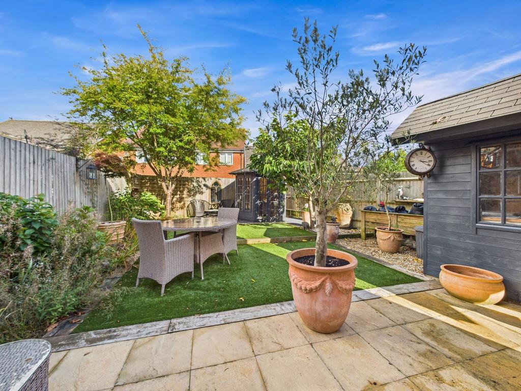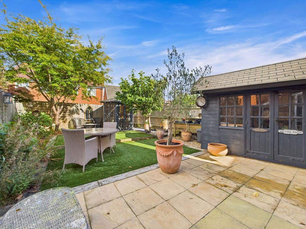 - Well-designed outdoor space with lawn, patio, and two versatile garden rooms with power and lighting