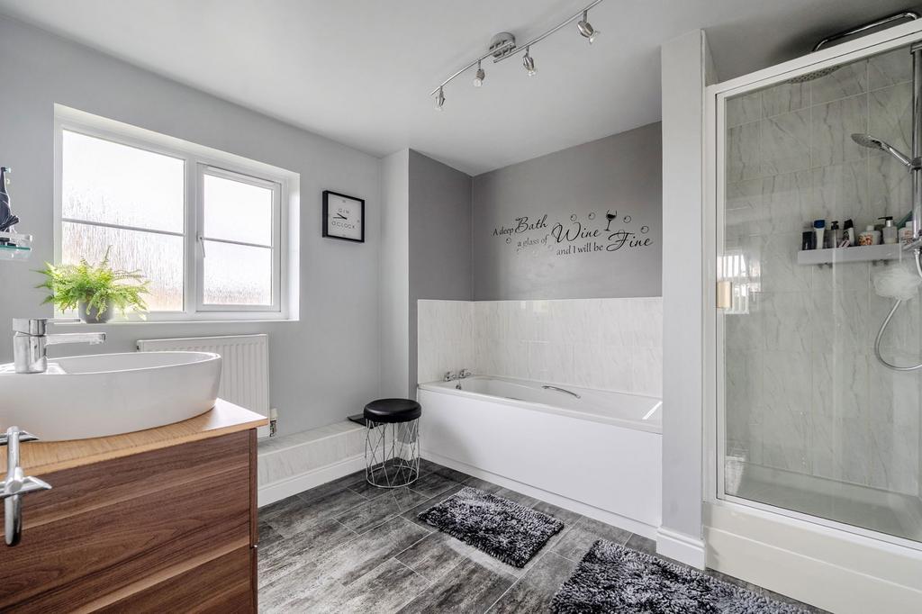 On the first floor, you’ll find two spacious doubles – both with built-in wardrobes – and a versatile single room, perfect for a home office, craft room, or nursery. A sleek family bathroom with rainfall shower adds comfort and convenience.
