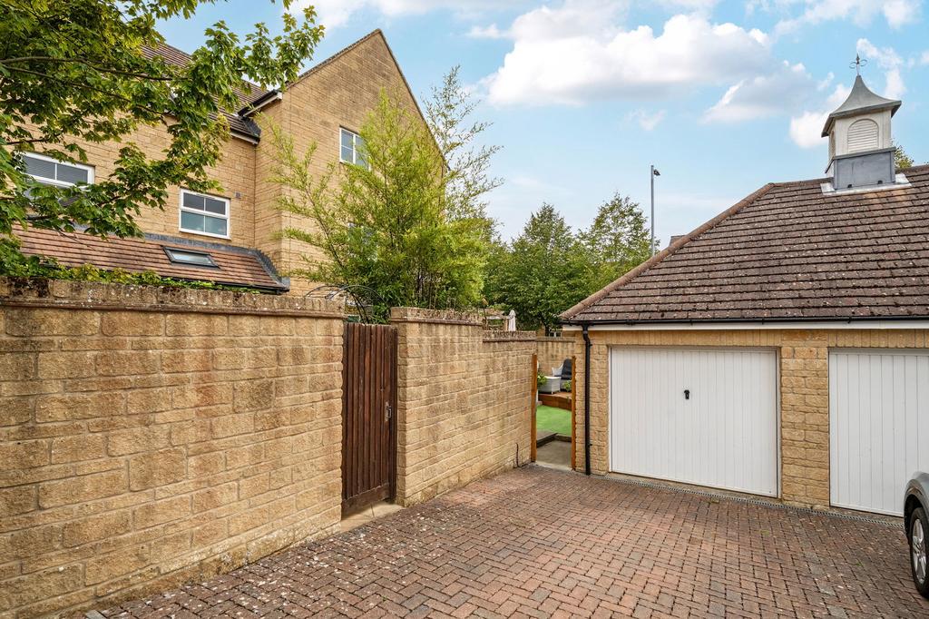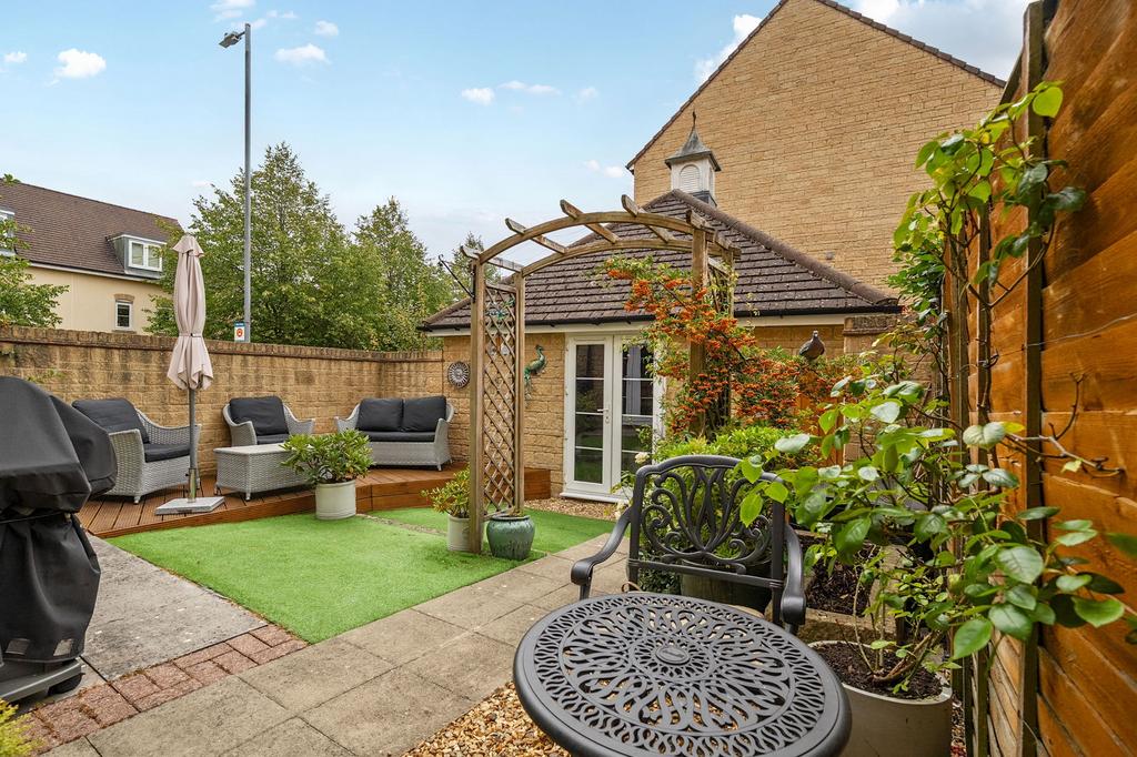 Outside, the garden is low-maintenance yet cleverly designed for enjoyment. A raised deck is ideal for sunbathing or evening drinks, while there’s still space for a dining table and barbecue – perfect for relaxed summer entertaining. From here, double doors open directly into the garage, offering extra flexibility for storage, hobbies, or even a games room. A block-paved driveway provides private parking, with side access for convenience.