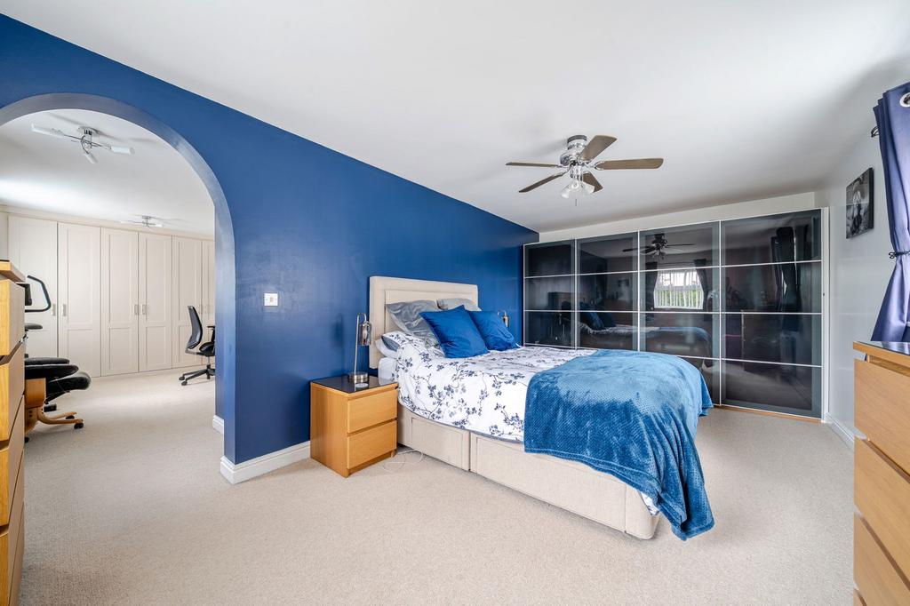 The entire top floor is devoted to the master suite – a real sanctuary. The bedroom itself is generous enough for a super king, while the adjoining dressing room with built-in storage can adapt to your lifestyle, whether as a walk-in wardrobe, private study, or even a small gym. The en suite is a retreat in its own right, with a bath, separate shower, and space to truly unwind.