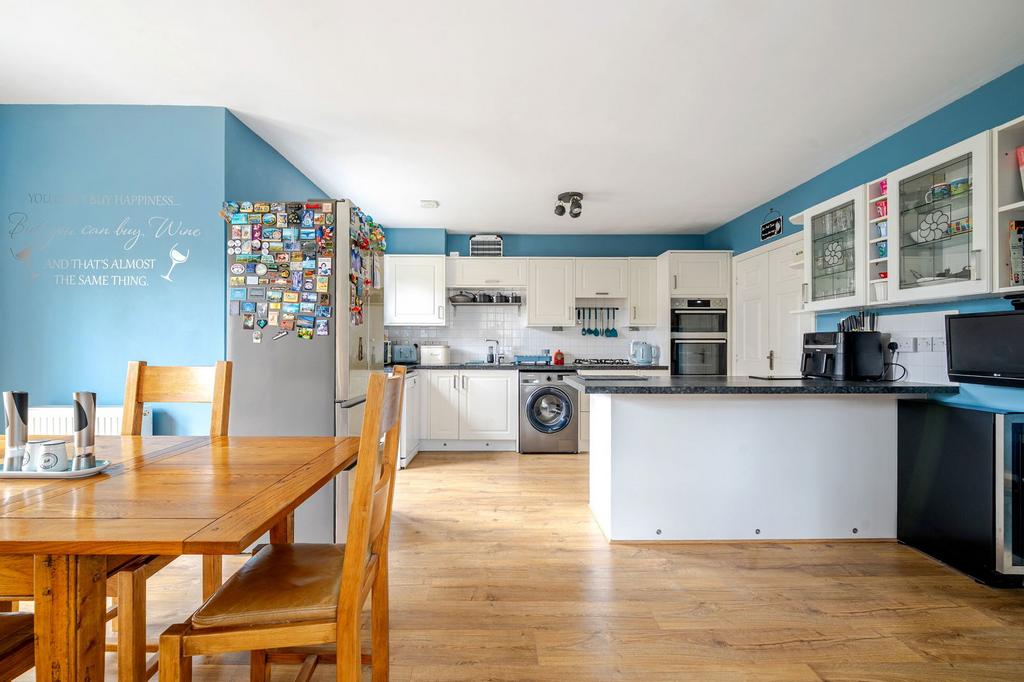 The true highlight of the home is the expansive kitchen/diner/family room. It’s a room that feels instantly social – whether it’s a big family meal, coffee at the breakfast bar, or children doing homework while dinner cooks. The walk-in larder and generous cupboard space keep everything organised, while French doors open seamlessly to the garden, making indoor-outdoor living effortless in the warmer months. An integrated fridge and freezer are tucked under the breakfast bar with additional spaces for a washing machine, dishwasher and further fridge/freezer.