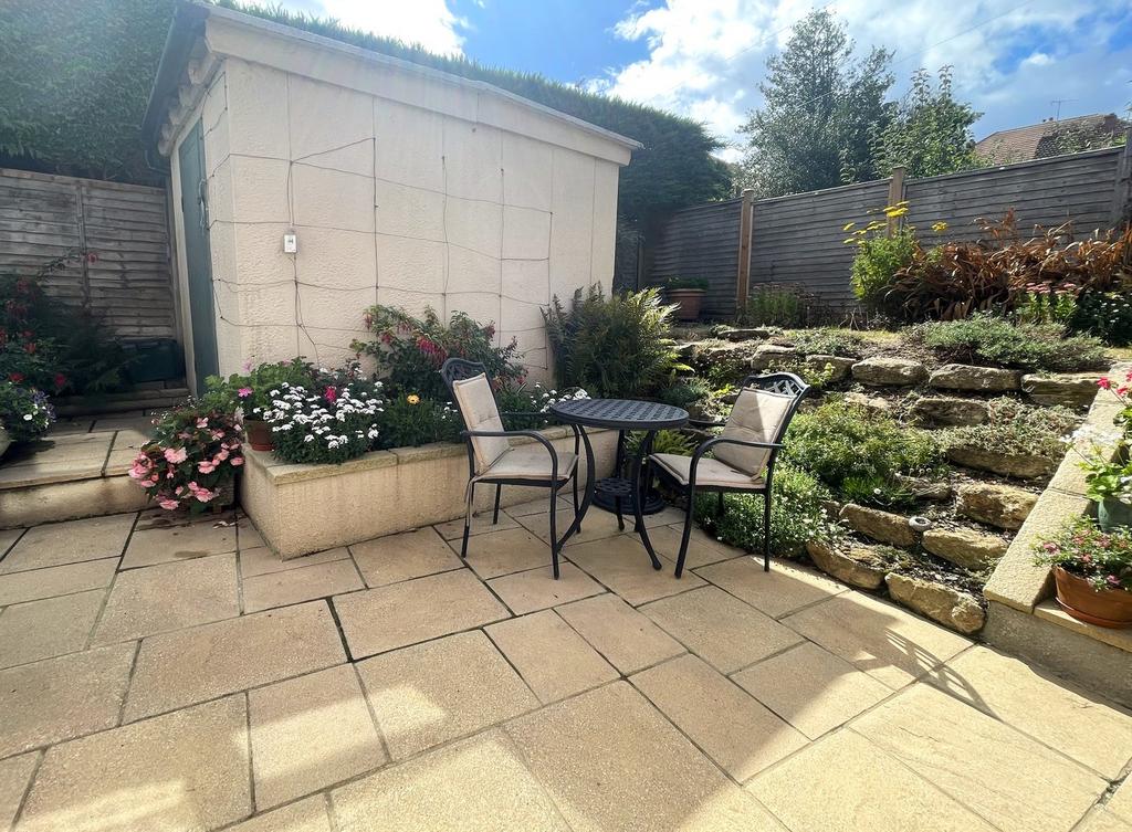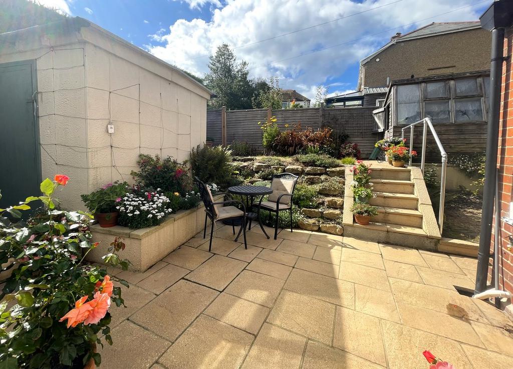 The garden can be accessed either from the entrance drive, the kitchen or the conservatory and comprises a good sized area of patio, with steps leading to an upper terrace, where there is access to a good sized shed.