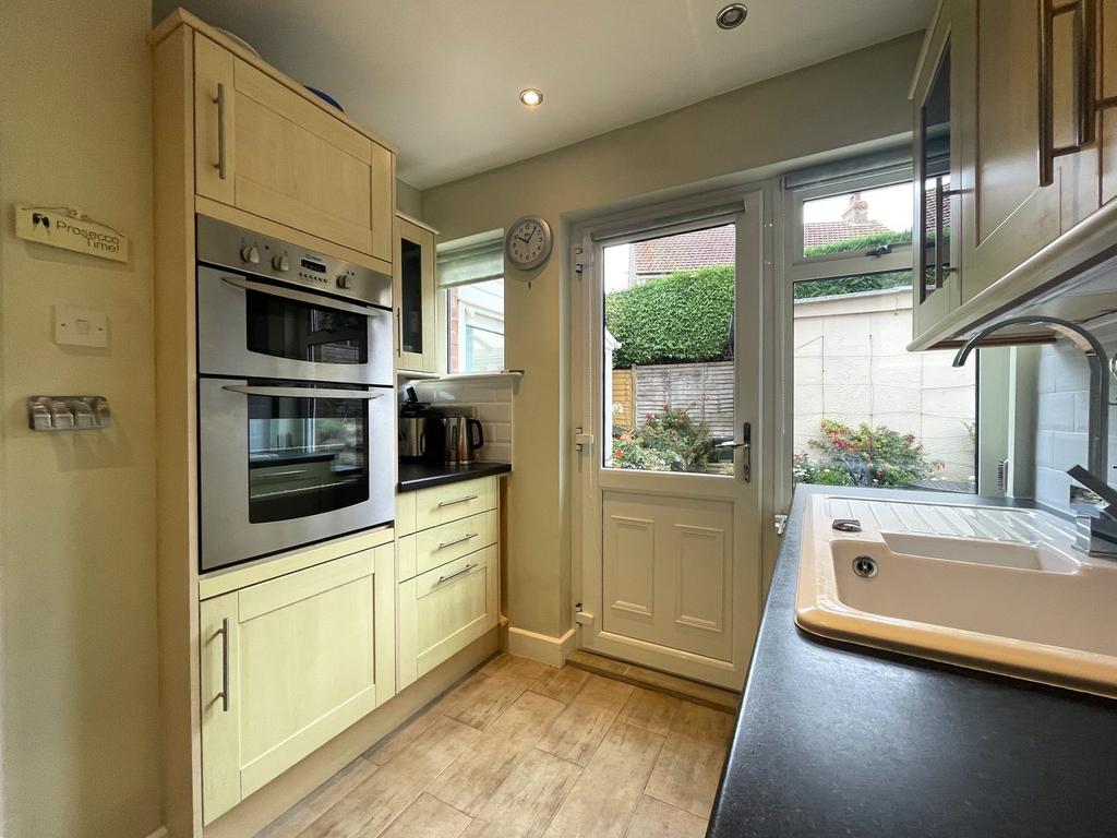 Door to rear garden with matching side windows. The kitchen has been principally fitted to two sides, with a range of matching wall and base units. On one side of the kitchen, there is an L shaped run of work surface, with inset one and a half bowl ceramic sink and drainer with chrome mixer tap, together with cupboards beneath including built in dishwasher. Inset four ring induction hob with extraction above and drawers beneath. Space for free standing fridge freezer. On the other side of the kitchen, there is another run of work surface with built in double oven and grill and further storage cupboards.