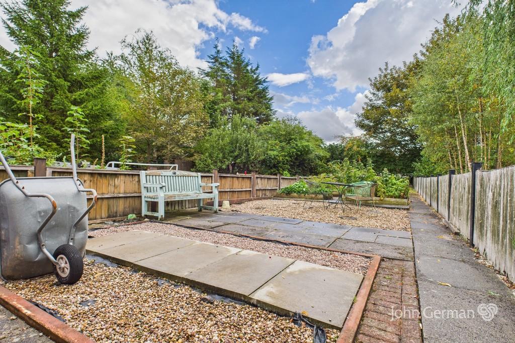 To the rear, the property enjoys a low-maintenance garden with patio, pebbled areas, and planters. Beyond this is a private parking area for two vehicles, a detached double garage with power, and a second lawned garden with raised borders, offering additional outdoor space to enjoy.